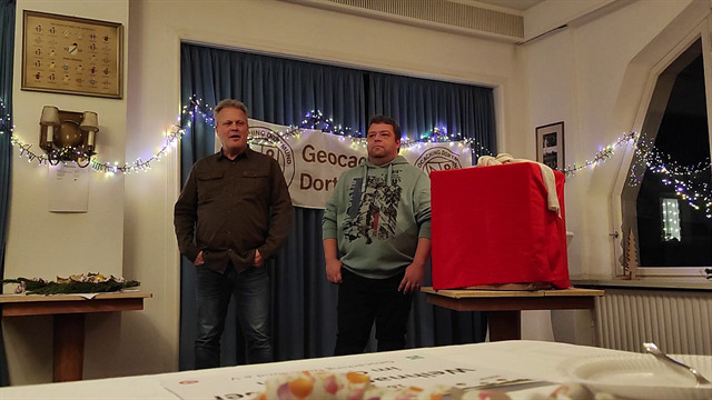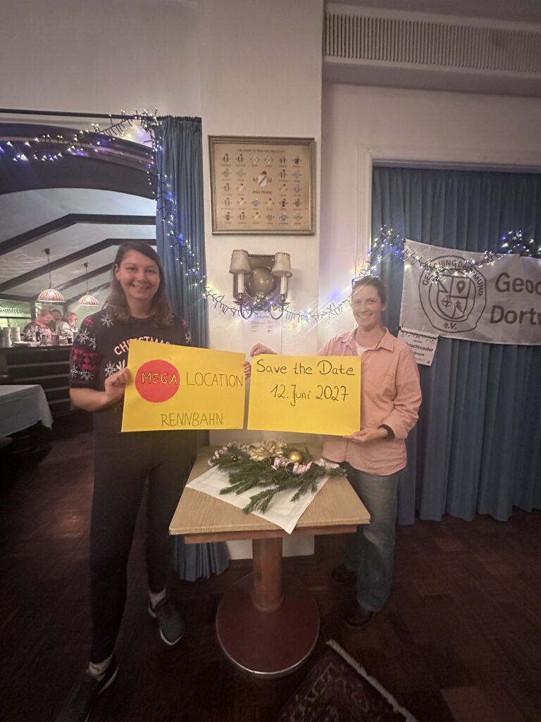 Der Höhepunkt des Abends ließ nicht lange auf sich warten: Die angekündigte „Bescherung“. Die Spannung im Raum war deutlich spürbar, denn viele ahnten bereits, dass hier etwas Größeres in der Luft lag. Als dann endlich das Geschenk ausgepackt wurde, war klar: Dieser Abend markiert einen historischen Moment für die Dortmunder Geocaching-Community. Die offizielle Bekanntgabe des ersten Dortmunder Mega-Events am 12. Juni 2027 – und das hier auf der Galopprennbahn Dortmund – sorgte für große Begeisterung, Applaus und strahlende Gesichter.